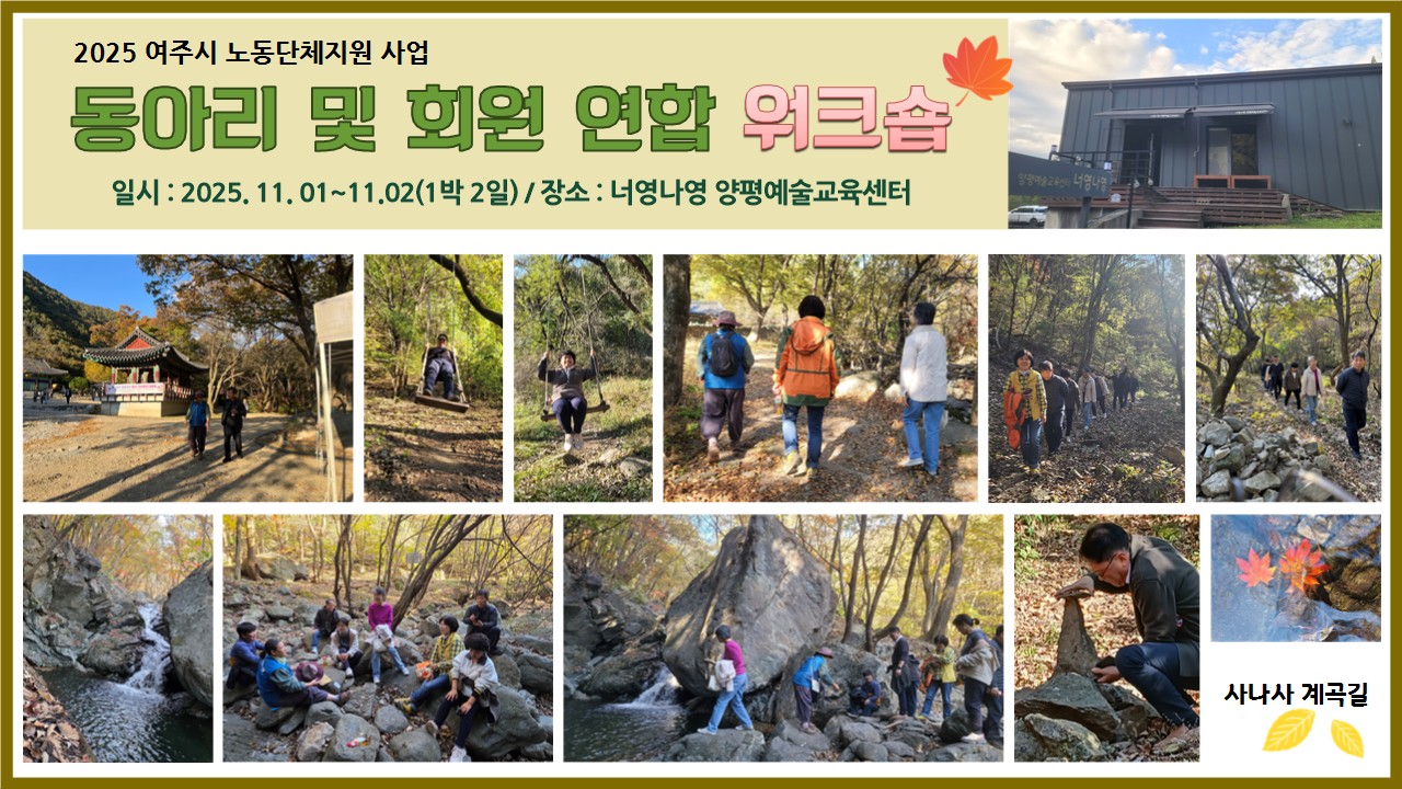 지난 11월 1일부터 2일까지 1박 2일간 양평 너영나영 예술교육센터에서 동아리 및 회원 연합 워크숍이 진행되었습니다. 깊어가는 가을, 자연 속에서 힐링하며 서로 소통하는 뜻깊은 시간을 가졌습니다.