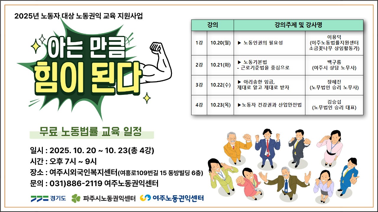 여러분의 소중한 노동권, 여주노동권익센터가 함께 지켜나가겠습니다. 많은 관심과 참여 바랍니다!